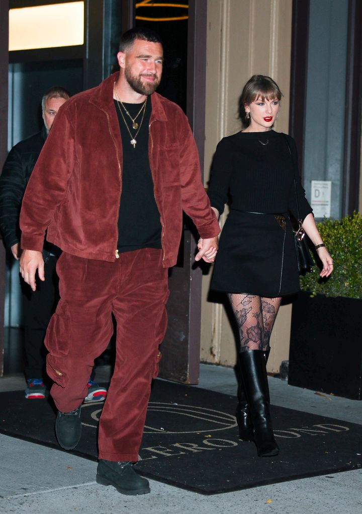 テイラーの友人の女優ブレイク・ライブリー&夫ライアン・レイノルズと会うため、レストランに向かうところ。交際中のアメリカンフットボール選手、トラヴィス・ケルシー(35)と仲良く手をつないで。