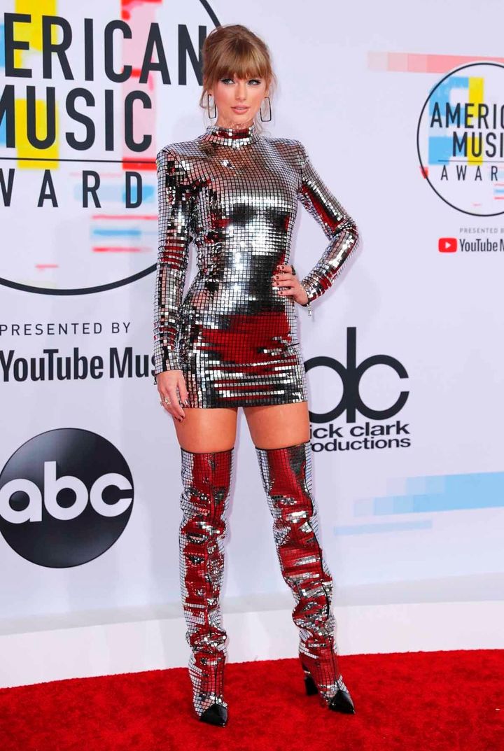 テイラー自ら“ヒューマン・ミラー・ボール”と呼んだ、バルマンによるメタリックのドレス&ブーツでレッドカーペットにお目見え。絶対領域といわれる太ももがセクシー!