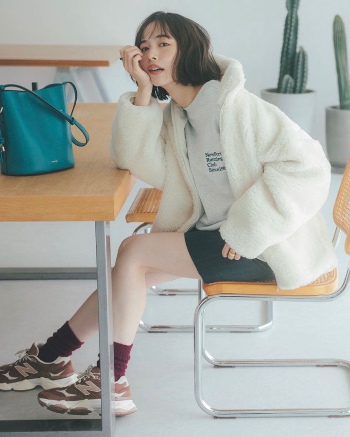 ボアブルゾン¥39,600(モリオリ/H3Oファッションビュロー)スウェット¥11,990(ビューティー&ユース/ユナイテッドアローズ 渋谷スクランブルスクエア店)Tシャツ¥9,900(アルページュストーリー プレスルーム)スカート¥24,970(エイチ ビューティー&ユース/エイチ ビューティー&ユース)リング[ 2本セット]¥39,160(ソコ/ZUTTOHOLIC)スニーカー¥24,200(ニューバランス/ニューバランス ジャパンお客様相談室)バッグ¥51,700(FURLA/FURLAJAPAN)ソックス/スタイリスト私物