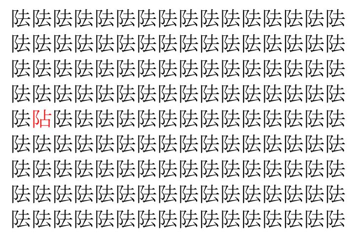 画像の中には、「阹」という漢字が縦に9行、横に16個並んでいます。 全部で144個となりますが・・・、そのうち1つは「異なる漢字」となってますよ!!