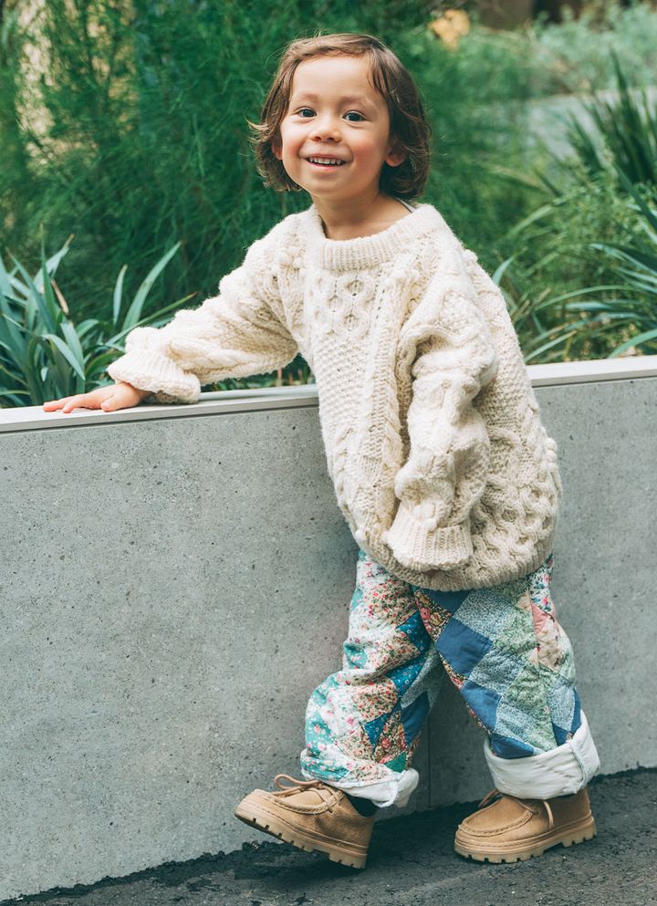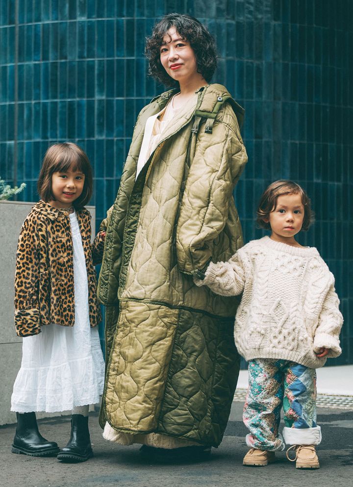 柔らかなホワイトを基調にした家族コーデは、お姉ちゃんのレオパード柄アウターが全体のスパイス役に大活躍! キルティングやアラン編みと、季節感あるレトロなアイテムを取り入れて、ノスタルジックなカジュアルスタイルの完成♪