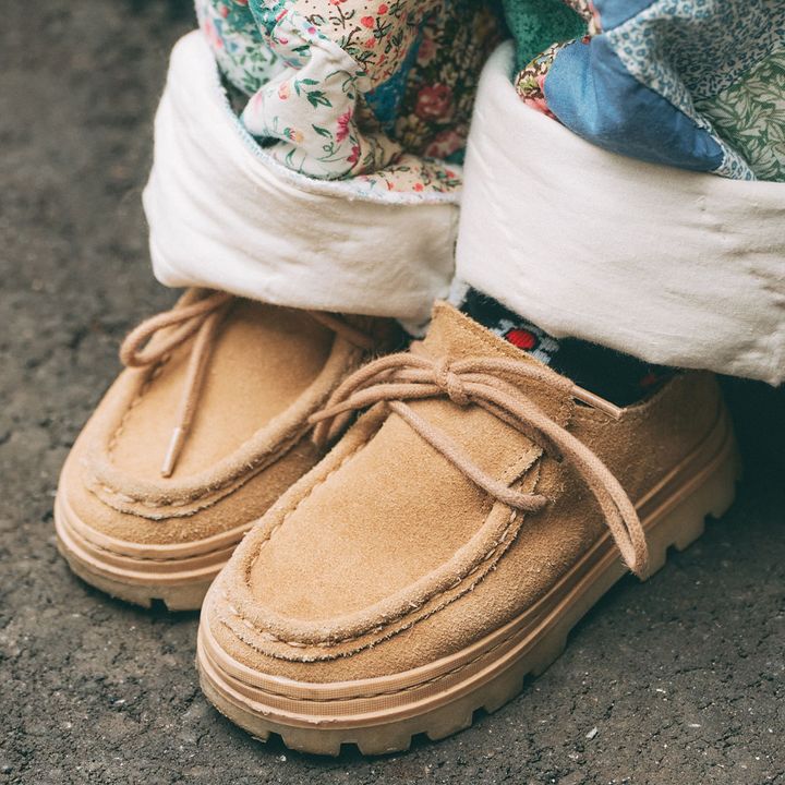 足元はベージュのスウェードシューズをオン! ボリュームのあるボトムスと合わせてこなれ感抜群なスタイリングに格上げ。