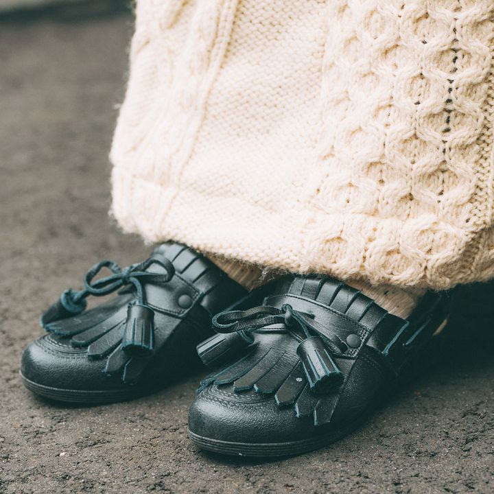 大ぶりなタッセルが目を引くシューズは『ベンサン』から。トイレサンダルの製造をしていた会社がファッション向けに打ち出したユニークなブランド。