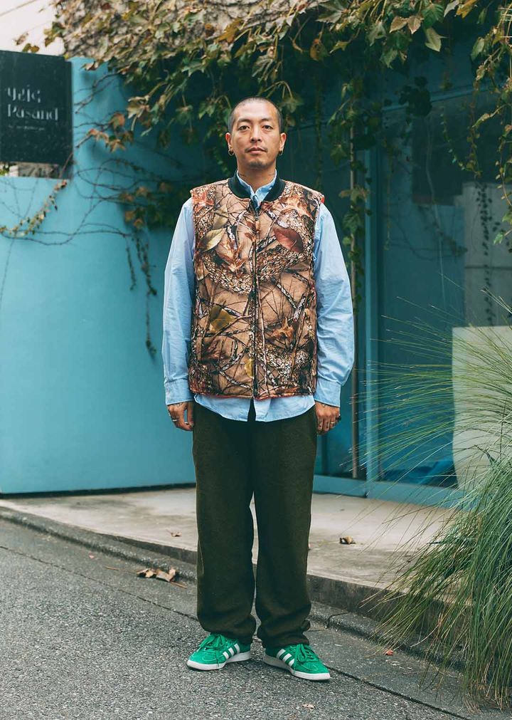 JOB:アパレルパッと視線を集めるリアルツリー柄の中綿ベストに、爽やかなブルーのシャツを合わせたほどよくエッジの効いたスタイルが素敵なJONさん。ボトムは今っぽいボア素材で抜け感をプラス。足元には『アディダス』のグリーンスニーカーを合わせて、コーデのアクセントに。item▼