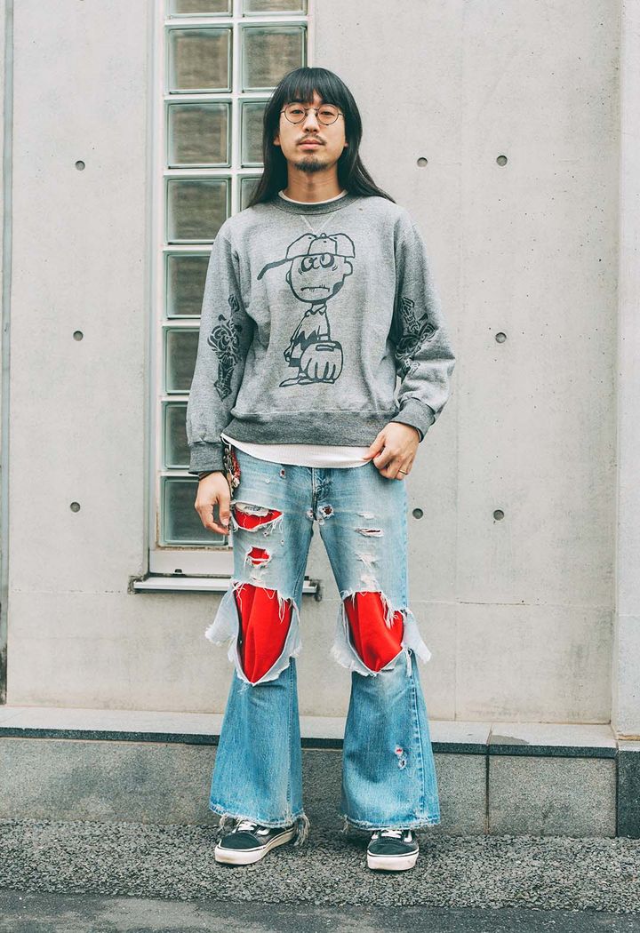 JOB:アパレル子どもたちのハートをわし掴みにするチャーリー・ブラウンのスウェットがお似合いなあらいたかひろさん。そこに、ワイルドなダメージデニムを合わせることで、キャラクターの可愛らしさをほどよく中和。70年代風のフレアシルエットのボトムがレトロな雰囲気を添え、オリジナリティ溢れる着こなしが完成。item▼