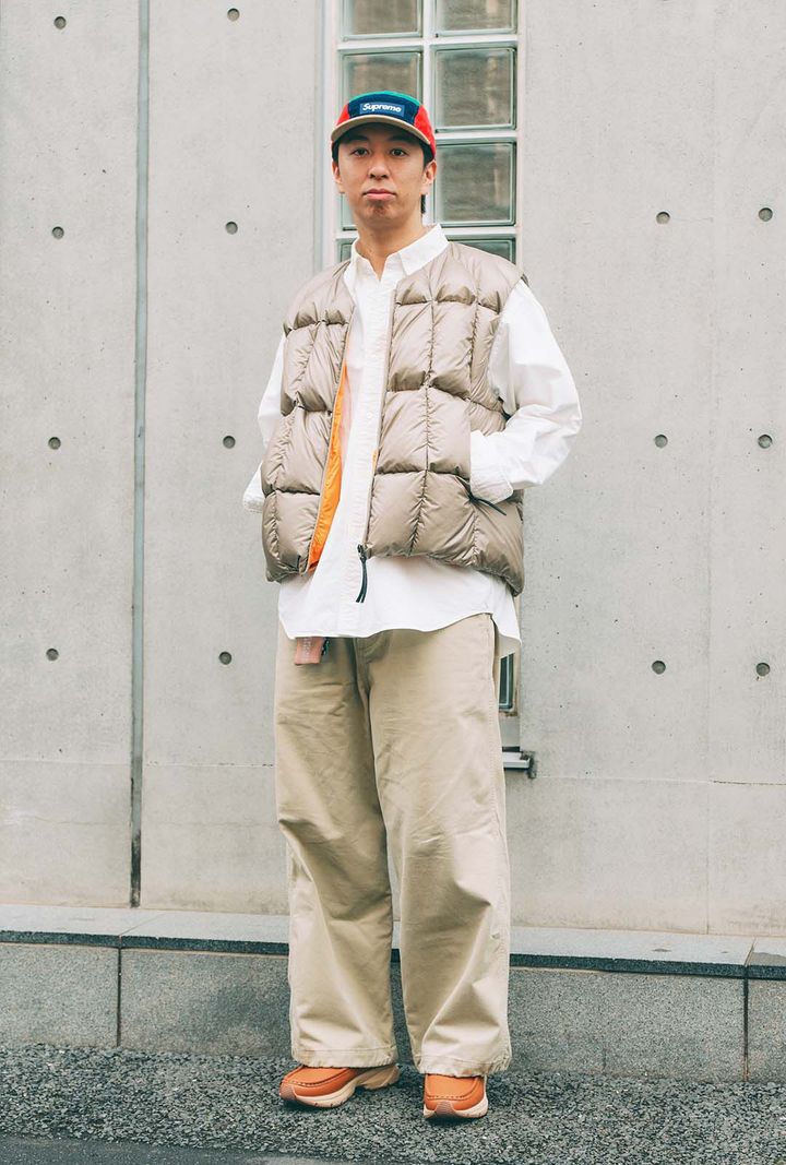 JOB:会社員やさしいベージュとクリーンなホワイトの2トーンコーデが、清潔感たっぷりでとっても好印象なチカラさん。きちんと感のある白シャツにダウンベストをレイヤードすることで、防寒しながらすっきりとした印象に。仕上げに『シュプリーム』のキャップでスポーティなムードをプラスして、さりげなくコーデを格上げ。item▼