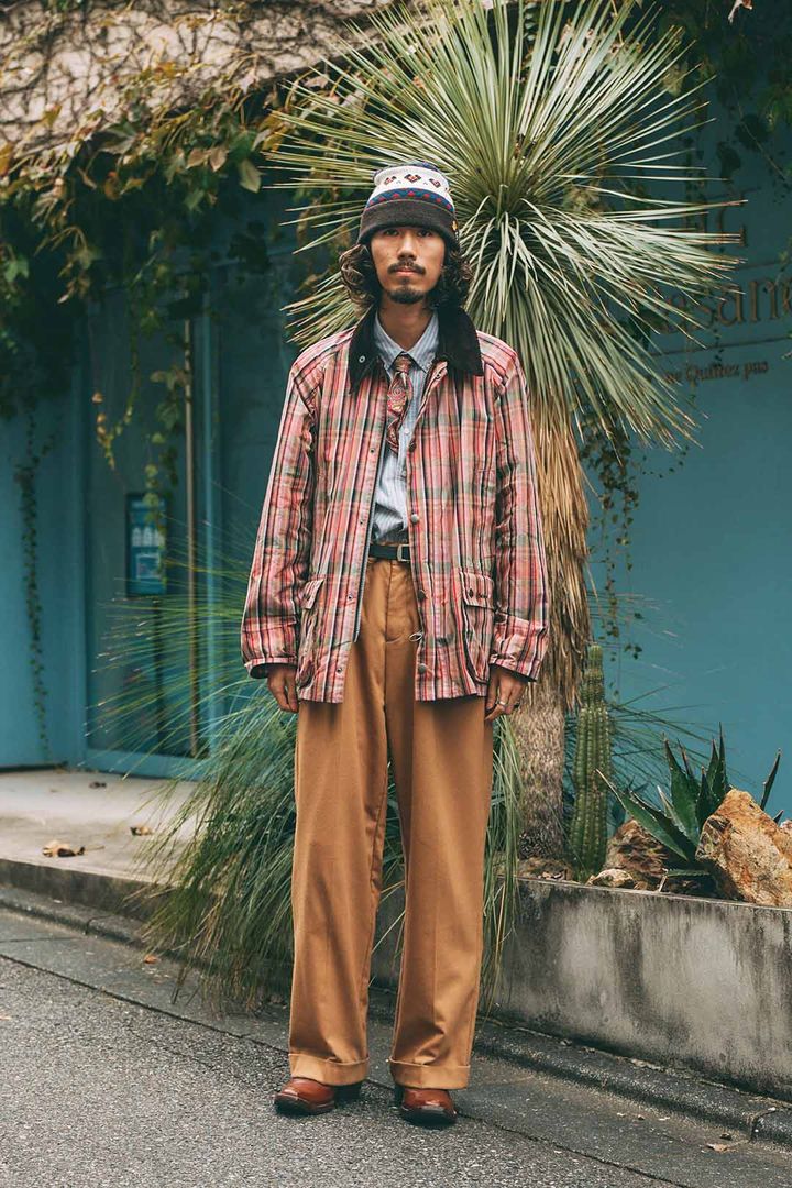 JOB:アパレル販売チェック柄アウターに美シルエットボトムを合わせ、ネクタイをオン。クラシックな着こなしにヴィンテージライクなエッセンスが光るRyotaさん。ストライプ×チェックのレイヤードやジオメトリック柄のタイ、ノルディック柄のニット帽など、柄を上手に取り入れた上級スタイルはマネしたくなるほど。item▼