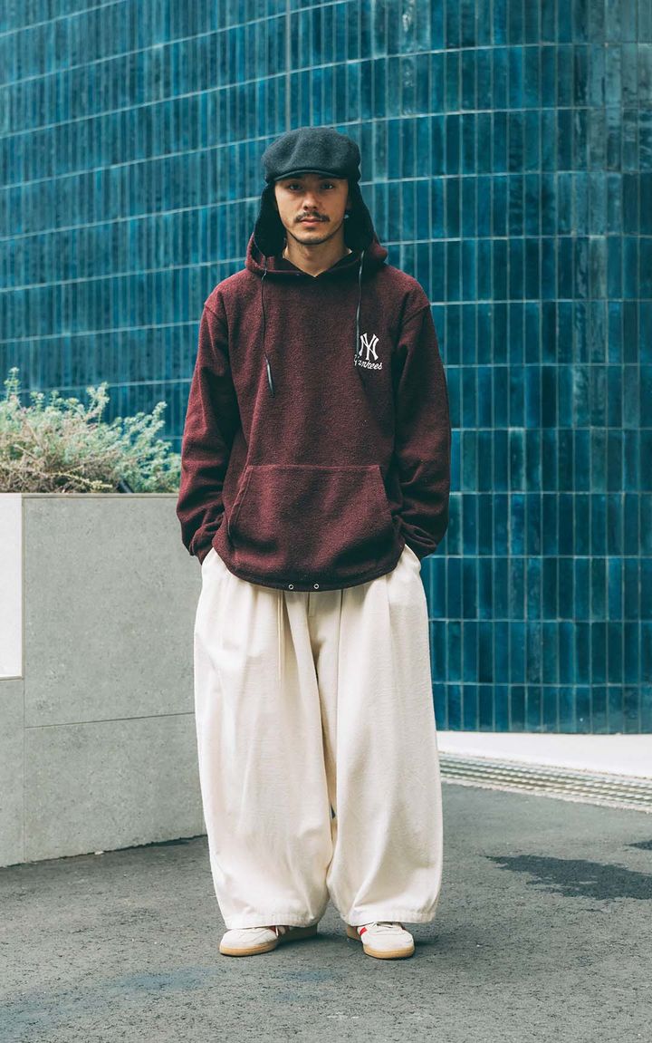 JOB:広告マーケティング、モデルふんわり広がるボリュームのあるシルエットが魅力の『シアーズ』のボトムに、ボア風のスウェットを合わせたベクトジョシュアアキラさん。重くなりがちな冬コーデも、ホワイトボトムで軽やかさと華やかさをプラス。イヤーフラップ付きハンチングで防寒対策もバッチリな冬のお出かけスタイル。item▼