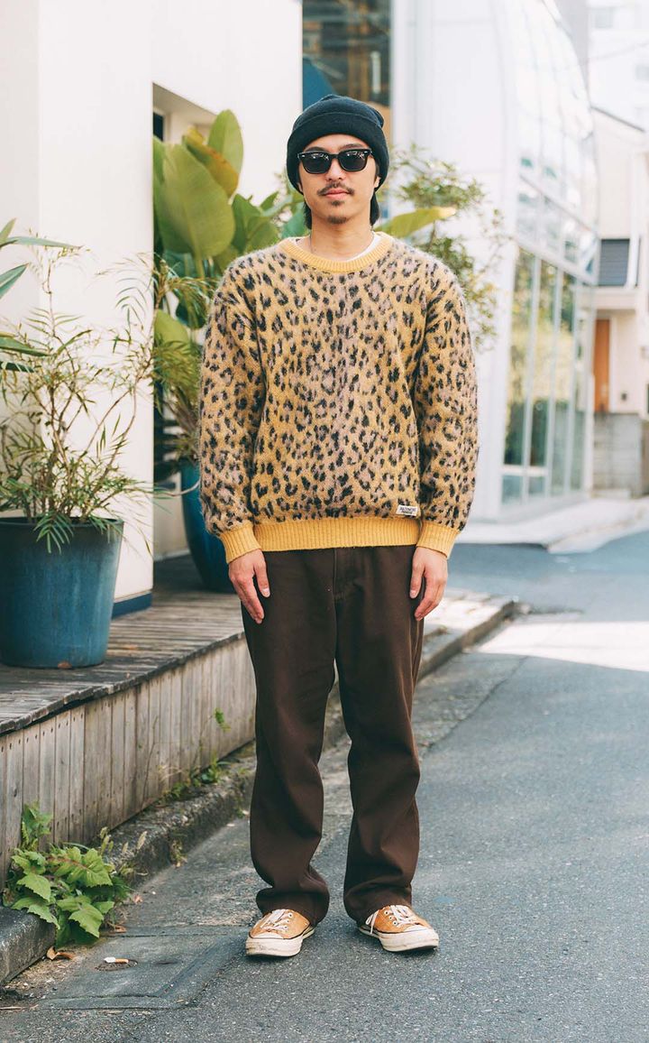 JOB:美容師ワイルドでチャーミングな『ワコマリア』のレオパード柄ニットを主役にしたibukiさん。そこに、ブラウンのボトムと黒のニット帽を合わせて、落ち着いたアースカラーで大人っぽくまとめた休日コーデ。シンプルな色使いでニットの存在感を引き立てつつ、リラックス感のある着こなしがお見事!item▼