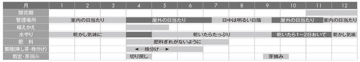 日当たりを好みます。春と秋は、直射日光の当たる屋外で管理し、真夏は強光で葉やけを起こしますので、風通しがよい明るい日陰で管理します。最低気温が10度を下回るようになったら室内に取り込み、冬季はガラス越しの日が当たる場所で、5 度以上を保ちます。