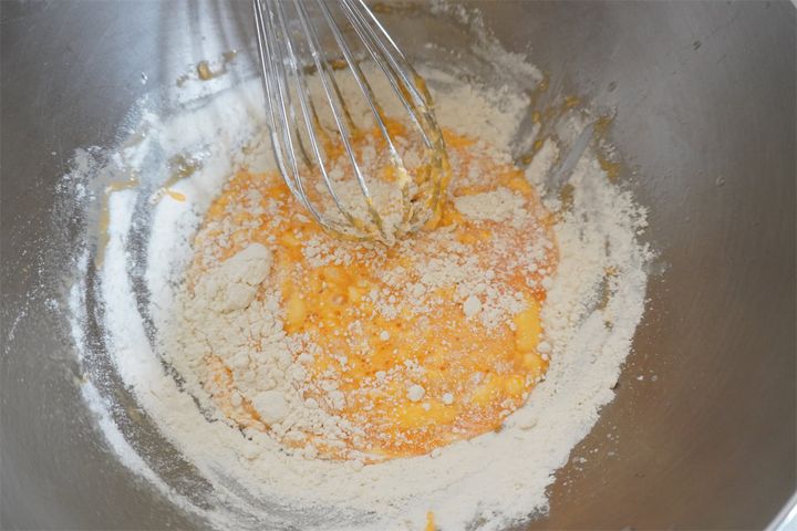 2. ボウルに卵を割りほぐす。水と小麦粉を加えてよく混ぜたら、1の長ねぎを加える。