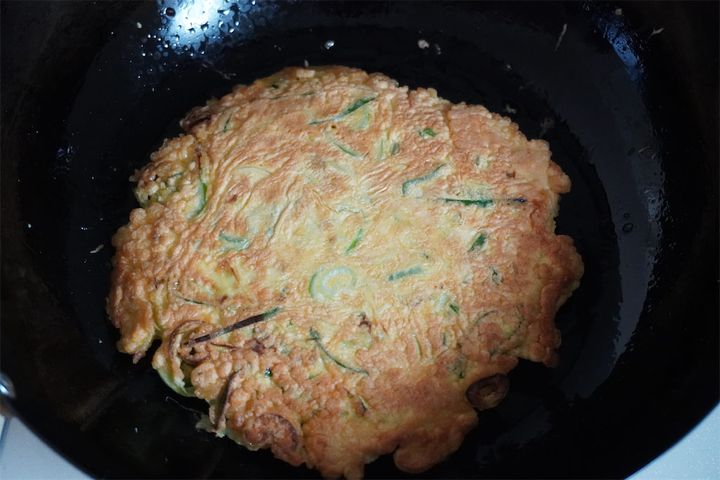 3. フライパンにサラダ油を引いて、2の半量を流す。3分ほど焼いたら裏返す。