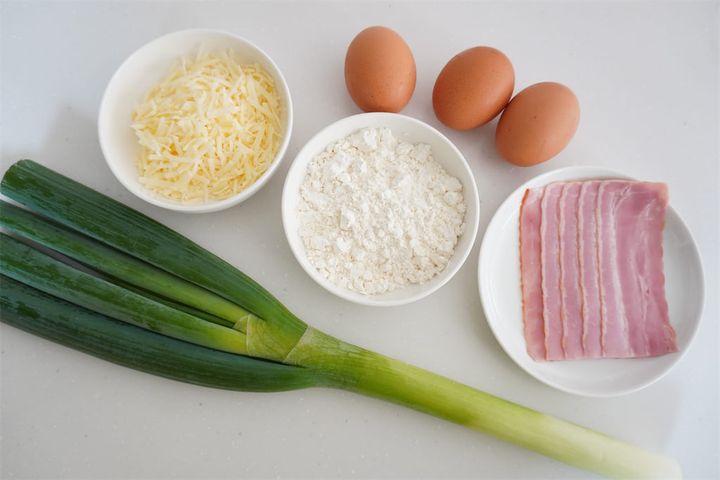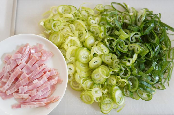 1. 長ねぎは3mm幅の小口切り、ベーコンは5mm幅に切る。