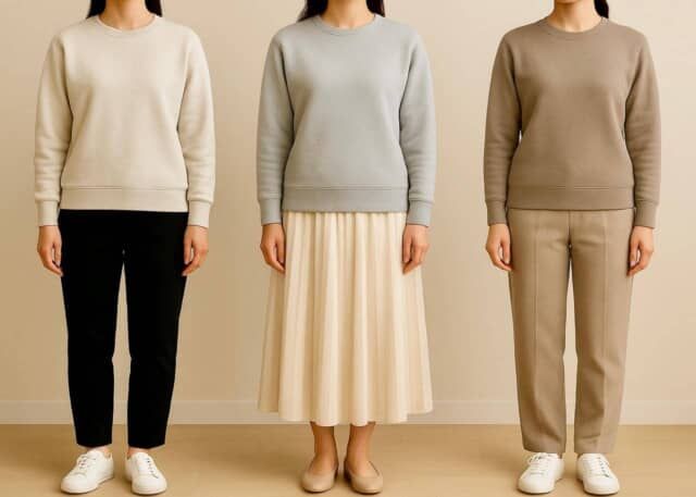 ▲ニュアンスカラーと程よいゆとりでつくる“今のバランス”。大人でも取り入れやすい冬のスウェットコーデ