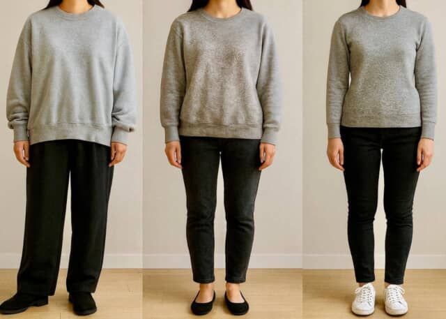 安心して着られる大きめシルエットは便利ですが、肩が落ちすぎたり、身幅が広すぎたりすると、体のラインがぼやけてしまい、大人世代にはやや難しく感じられることがあります。重心が下がると全体がもったり見えやすく、スウェットの“ラフさ”が強く出すぎてしまうのも気になるところ。