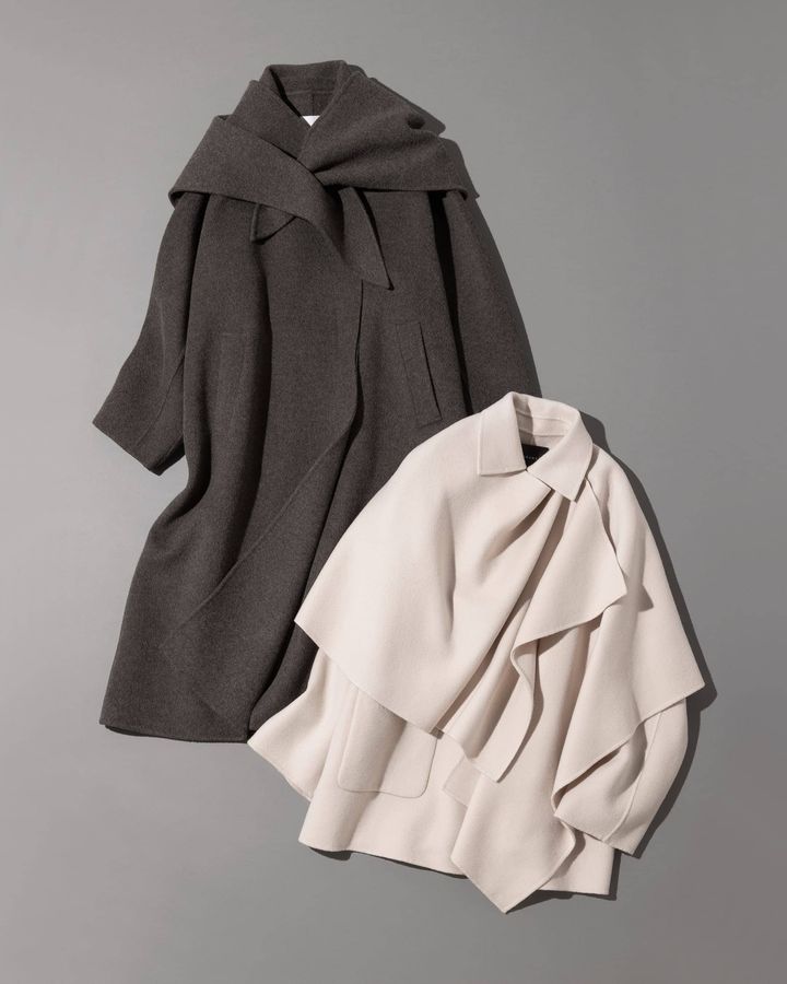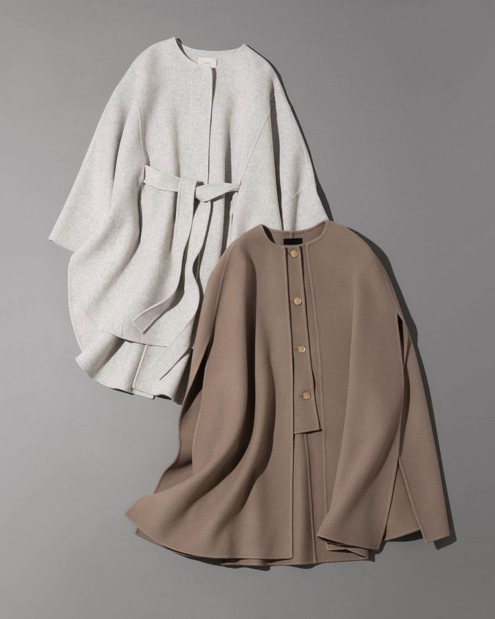 〈右〉キャメルポンチョコート¥83,600(ヴェルメイユ パー イエナ/ヴェルメイユ パー イエナ 日本橋店〈左〉グレーポンチョコート¥80,300(LE PHIL/LE PHIL NEWoMan 新宿店)