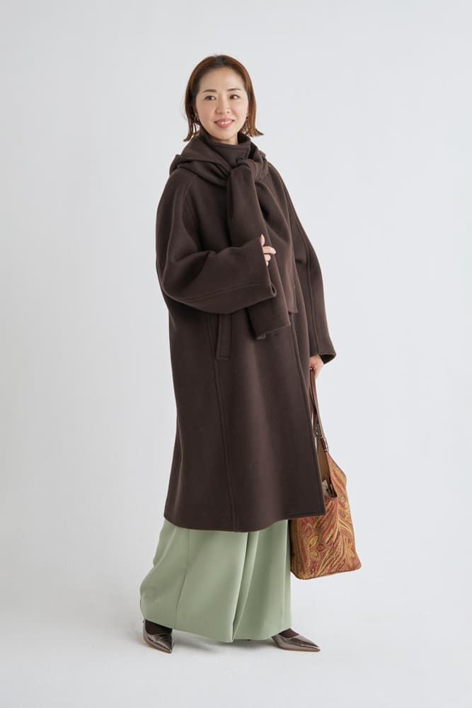 フードマフラー付きコート¥42,900(メゾンスペシャル/メゾンスペシャル 青山店) パンツ¥50,600(アドーア) バッグ¥63,800(ア ヴァケーション/ノーベルバ) パンプス¥17,600(ダイアナ/ダイアナ 銀座本店) イヤリング¥6,820(イットアトリエ/フォーティーン ショールーム)タイツ(スタイリスト私物)