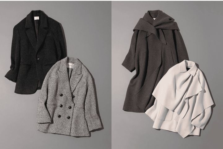 今年多く出ているマフラー付きコートは、顔回りにアイキャッチポイントを作って目線を上げることで体型悩みに目を行かせない、そんな着やせテクニックを活用できます。〈右〉大判ストールのようにいろいろな巻き方を楽しめる1枚。〈左〉ちょこんとついたプチスカーフサイズのマフラーが可愛い存在感を放ちます。