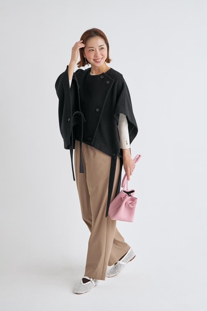 袖ぐりが広くドロップショルダーで肩回りが気にならない、ポンチョ型のアウターは体型カバーの万能選手。長すぎない腰丈くらいまでのものを選べば大柄見えも回避できます。〈右〉ボタン付きの身頃が仕込まれたデザインがレア。〈左〉ロングセラーの人気ポンチョ。袖があるタイプなので防寒力も担保。