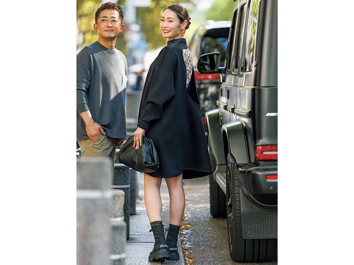 『お互い仕事で忙しく飛び回っているので、年1、2度は夫婦で食事を楽しむように。黒ワンピもアルミバッグやTabiブーツでモード感を忘れません。』