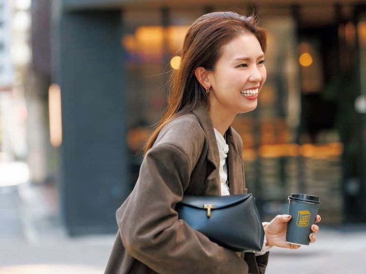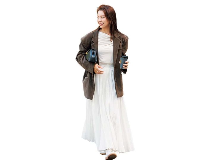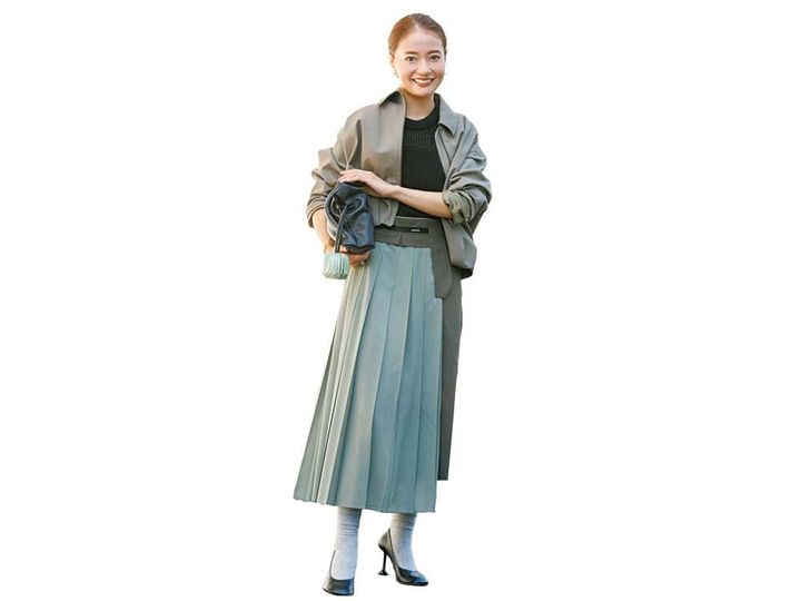 BAG / TOTEME、JACKET / The Frankie Shop、TOPS / BANANA REPUBLIC、SKIRT / ebure、SHOES / Maison Margiela、EARRINGS / BOTTEGA VENETA
