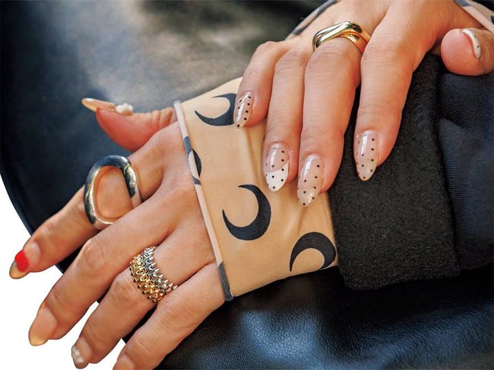 『ラメニットにレザースカートで甘辛に。スカートは前スリットなのでハイチェアでも座りやすいんです。バーでは手元に目がいくのでネイルケアは念入りに。』