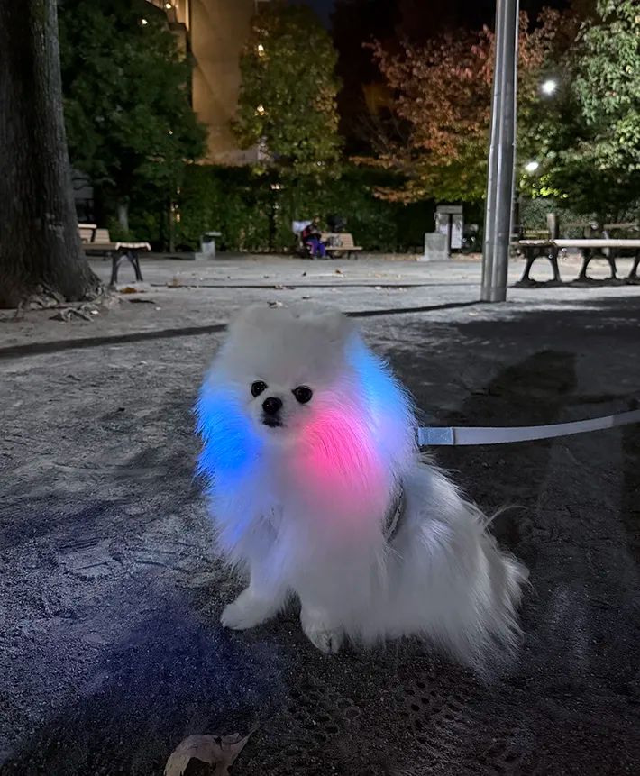 光る首輪をつけたおもちちゃんは、これからの季節、多くの人を魅了することでしょう!