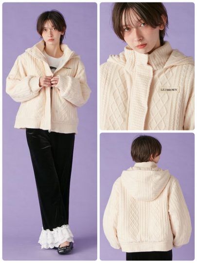 めずらしいドッキングデザインに視線集中。ベーシックなデザインに飽きた方におすすめです。ニットは3種類の編み地で切り替えて、立体感をアップ。胸元にあしらったブランドロゴもポイントです。さらに大きめなフードが顔まわりを華やかに彩ってくれます♡