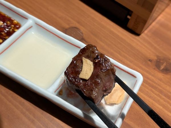 絶妙なサシが美しい牛ハラミをミディアムレアで!柔らかな食感がたまりません。ニンニクチップと塩でシンプルにいただくと、ジューシーな肉の旨味がダイレクトに感じられます。