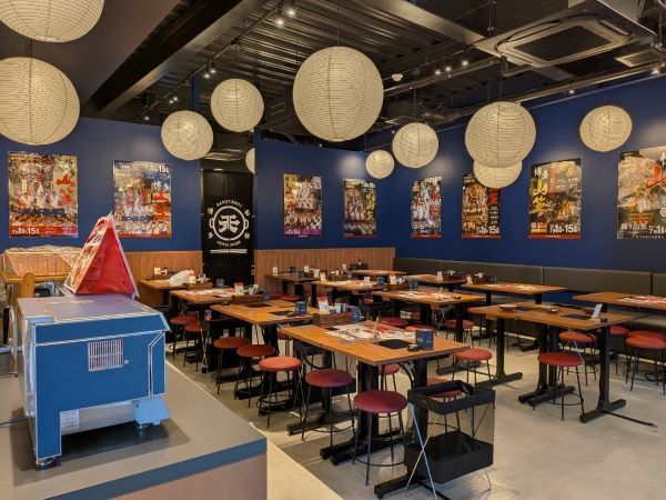 客席数は3店舗分合計で258席と、広々とした店舗(のれんの奥も客席です)。『もつ酒場楽天地Café Bar』には博多祇園山笠の公式ポスターが貼られています。七流+上川端通の8種類の山笠を見ることができます。「祭り以外の時期にもお客さんや山笠の関係者の方に見ていただけるようにしました。そして来年3月には、店内に飾り山笠が登場する予定です!」と大将の水谷さん。これはすごいですね。