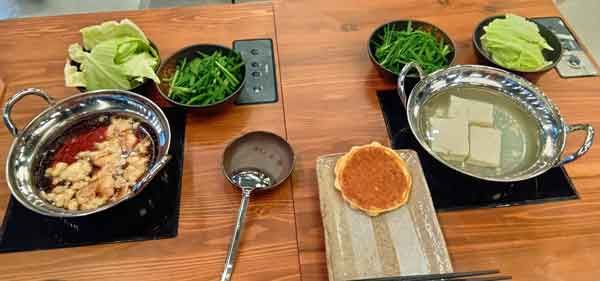 お肉や野菜を選んで、2種類の鍋を用意しましたよ。左は、定番の「博多もつ鍋」。右は「嬉野温泉湯豆腐鍋」といって、豆腐の表面が溶けた状態で味わうのが特徴の鍋に、もつ肉も入れて作ります。