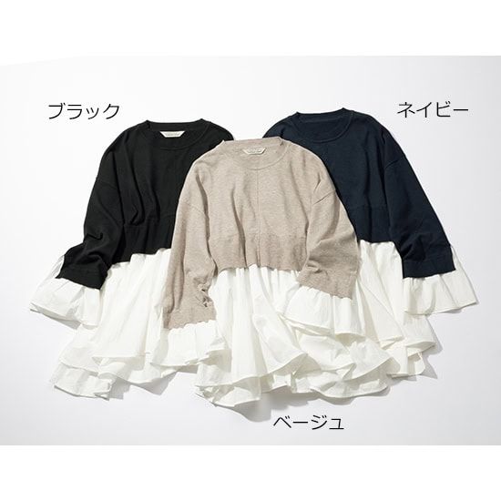 短か丈のニットとシャツが重なったレイヤードデザイン。長さもあるのでお尻はしっかり隠してくれます。裾にシャツ生地をたっぷり使い、ボリューム感が高見えします。