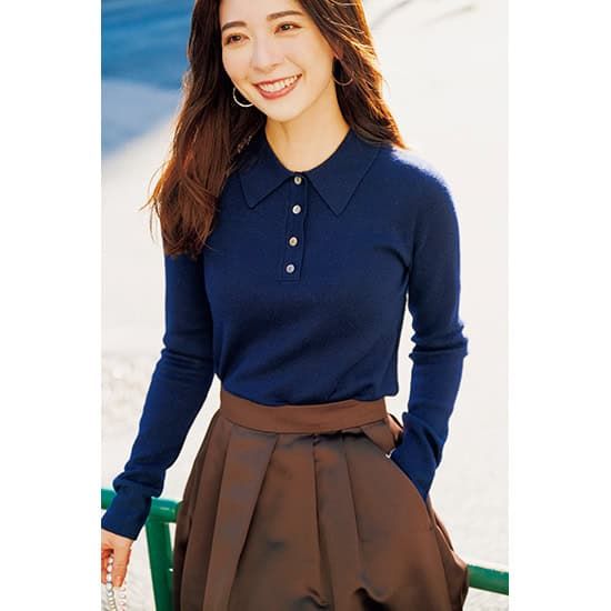 きちんと見えするポロニットは、長めの袖が今年らしい1枚。洗練されたシルエットと肩回りや袖付けなど、立体的な設計にして着用時のすっきりとしたシルエットに拘りました。ふんわりスカートやタックパンツなどボリュームのあるボトムスと合わせたい。