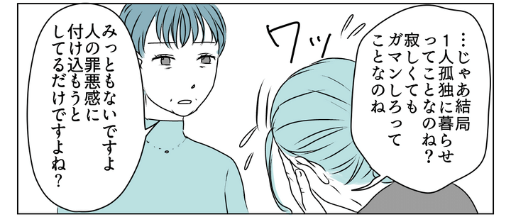義母は私に過去の嫌がらせを指摘されて泣き落としに転じようとしました。そして「孤独に耐えろと言うのか」と感情に訴えますが、母が「かわいそうアピールで罪悪感に付け込むのは情けない」と一蹴。