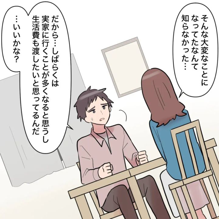 「そんな大変なことになってたなんて知らなかった・・」と呟くと、「だから・・しばらくは実家に行くことが多くなると思うし、生活費も渡したいと思ってるんだ・・いいかな?」とトモヤに生活費を援助したいと切り出され、