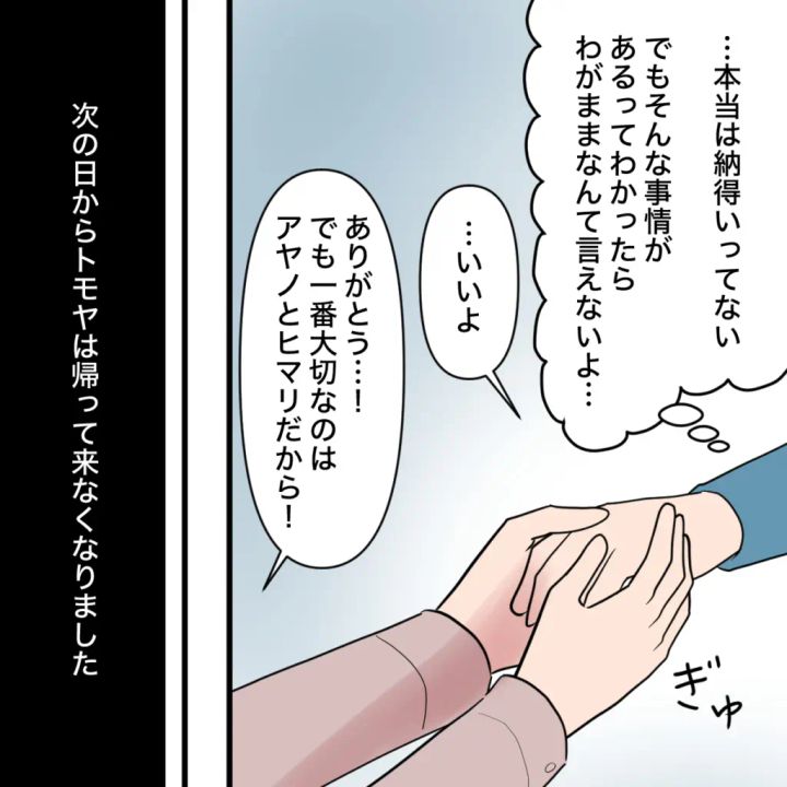 「・・本当は納得いってない。でもそんな事情があるってわかったら、わがままなんて言えないよ・・いいよ」私がそう言うと、「ありがとう・・!でも一番大切なのはアヤノとヒマリだから!」そう言ってトモヤは私の手をぎゅっと握りました。強い絆で結ばれているトモヤと私、そう思っていたのに・・。