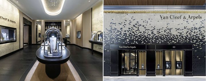 メゾンのモノグラムを想起させるロザンジュ模様のファサードがシンボリック。ゆったりとした店内は人気コレクションが一堂に会し、サヴォアフェールとメティエダールが融合した貴重なタイムピースも揃います。壁には「ヴァン クリーフ&アーペル」のインスピレーション源である花や蝶などの自然モチーフがあしらわれ、優美な世界観を演出。広々としたVIPルームも用意され、くつろぎながら過ごせます。