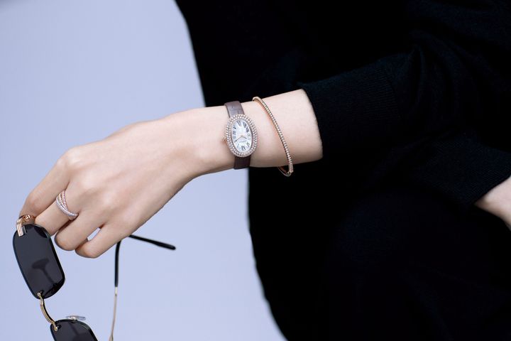 1912年に登場して以来、優雅さを保ちながら刷新を続けてきた“ベニュワール”。文字盤にマザーオブパールを用いたモデルは、卓越した職人技によって天然素材の美しさを最大限に引き出しました。絶え間なく揺らめく虹色の煌めきが、目に心地よくエレガント。さらにベゼルに敷き詰めたダイヤモンドの輝きをセミマットベージュのアリゲーターストラップが品よく際立たせ、ジュエリーウォッチとしての存在感を高めています。