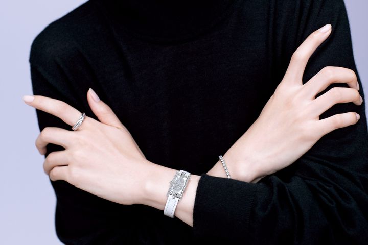リング[ダイヤモンド×WG]1,232,000円~ ブレスレット[ダイヤモンド×Pt]5,907,000円(ともに<a href="https://www.harrywinston.com/ja" target="_blank">ハリー・ウィンストン</a> tel.0120-346-376) トップス/132,000円(<a href="https://johnstonsofelgin.com/ja-jp" target="_blank" data-vars-ga-outbound-link="https://johnstonsofelgin.com/ja-jp" data-vars-ga-ux-element="Hyperlink" data-vars-ga-call-to-action="ジョンストンズ オブ エルガン" data-vars-ga-product-id="aed4c37d-36e4-4e64-a16e-4cb56c71ae9e" rel="nofollow" data-href="https://johnstonsofelgin.com/ja-jp" data-product-url="https://johnstonsofelgin.com/ja-jp" data-affiliate="false" data-affiliate-network data-vars-ga-product-price="$0.00" data-vars-ga-product-retailer-id="b868beec-344d-4d94-b2d0-2d233bd8de3a" data-vars-ga-link-treatment="(not set) | (not set)" data-vars-ga-axid="75e392f2-73a8-4b1e-b2b6-0037e22e3169">ジョンストンズ オブ エルガン</a> tel.03-6427-9452) 撮影=浅井佳代子