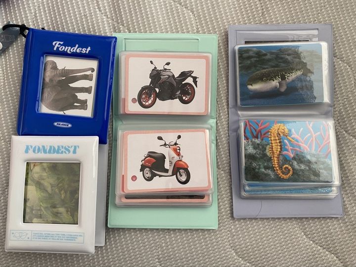 ダイソーの「PVCカードケース」と「ものしりカード」を使ったミニ図鑑。ものしりカードはいくつか種類があるそう。動物や乗り物など、子どもの興味に合わせて選べる点がうれしいですね。カードを差し入れるだけなので簡単です。
