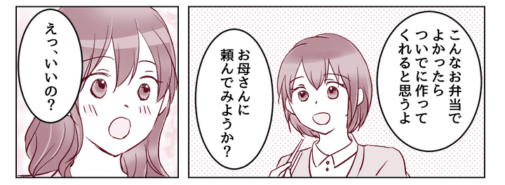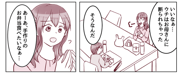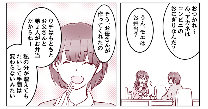 私はアカネ。25歳の会社員です。実家に住んでいるため、家事はすべて母がやってくれます。そんなある日、職場で社員食堂の休止のお知らせがあり、しばらくお昼ご飯を自分で調達しないといけなくなりました。けれど母に「お弁当を作ってほしい」とお願いしたら断られてしまったのです。高校時代も毎日お弁当を作ってくれていたんだから、作ってくれればいいのに……。仕方なくコンビニのおにぎりを食べていたら、同期のモエが嬉しい提案をしてくれました。
