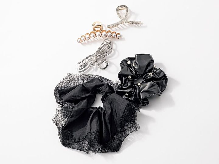 上から・クリップ¥1,430(アネモネ/サンポークリエイト)、クリップ¥8,800(フランス ラックス/ピーアンドティートレーディング)、クリップ¥1,540(アネモネ/サンポークリエイト)、シュシュ¥1,430(アネモネ/サンポークリエイト)、シュシュ¥8,250(heyep)