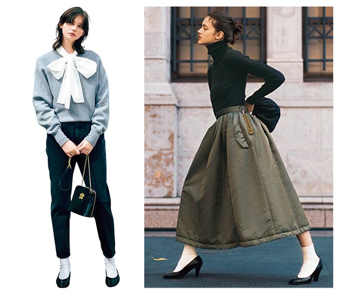 フレアスカートやボウタイブラウスを主役にしたレディなスタイリング。足元の肌感をセーブすることで隙をなくし、落ち着いた佇まいに。フェミニンなアイテムの美観を維持しながら、締まりをつけて大人びた甘さへ。