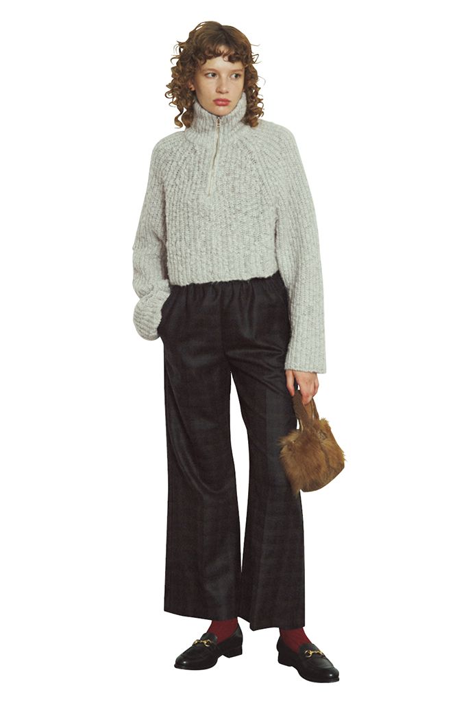 ストイックな黒タートルを、大胆なクロップド丈で刷新。たっぷりとゆとりを持たせた袖と、潔い短丈とのコントラストが、上半身を逆説的に華奢に見せてくれる。
