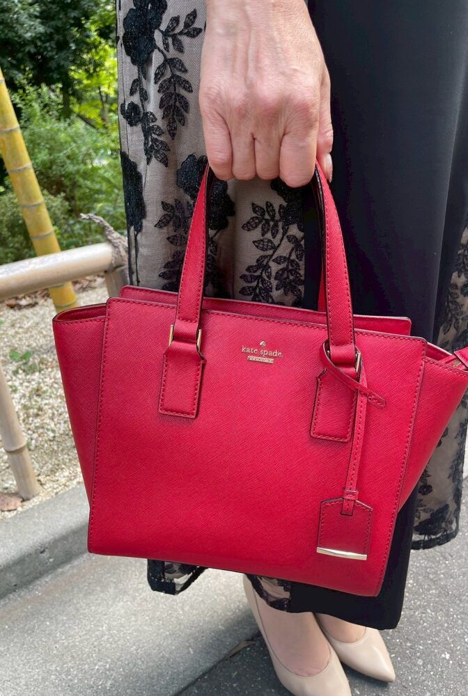 自然と視覚効果が計算されたデザインのワンピースがエレガントで素敵です。黒を卒業したいという思いからアクセサリーやバッグなどの小物からカラーを上手に取り入れているところは、同じような思いの方にも真似したくなるポイントですね。