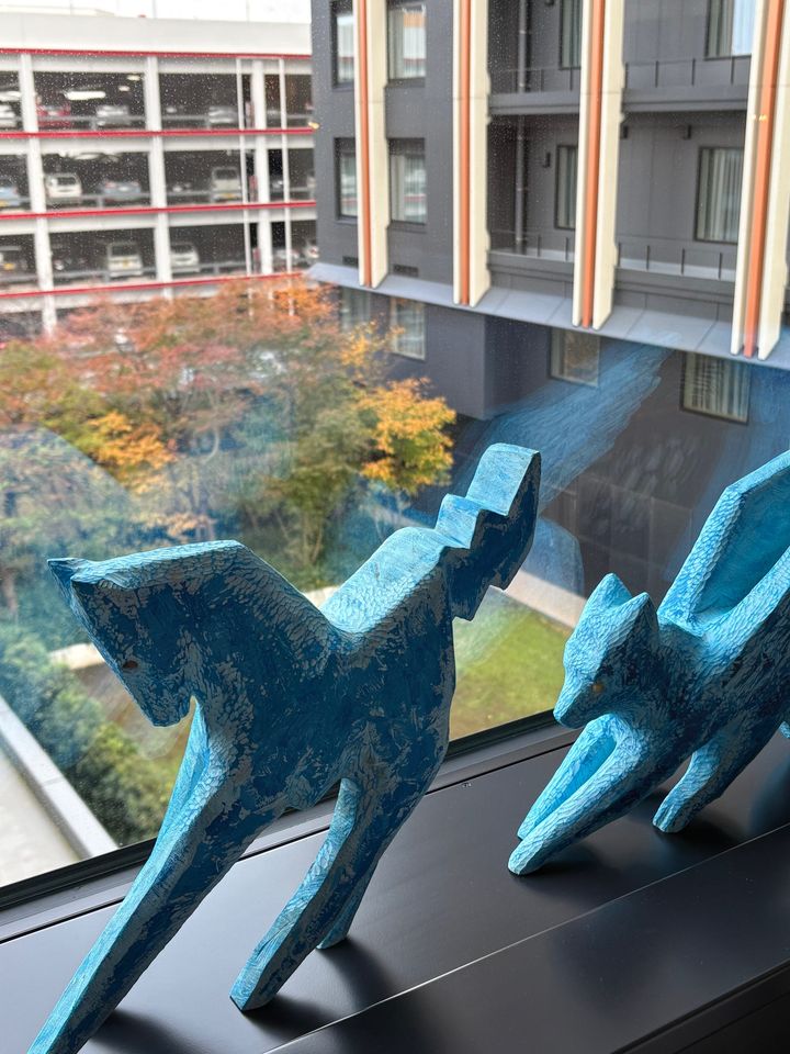日本で学んだモンゴル人作家・サルチョード・イルの木彫。外景が見える窓辺の展示は、ギャラリー空間ではあまり見ることはなく、新鮮。(小山登美夫ギャラリー) 撮影=田中敦子