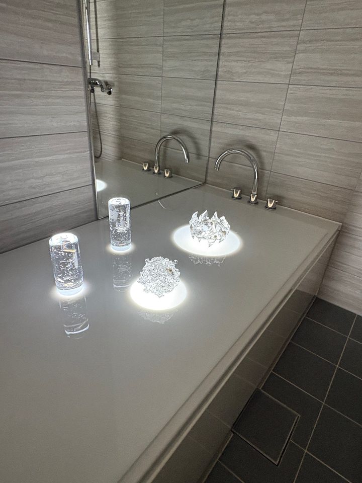 バスルームも展示スペースに。ライティングの効果もあってミステリアスな雰囲気。ガラス作品は地村洋平作。(KOTARO NUKAGA) 撮影=田中敦子