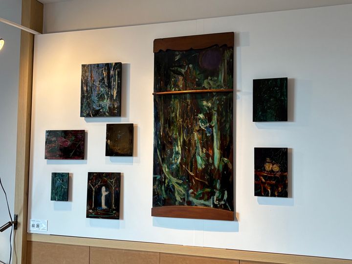 森安音仁作「森は霞む 小」。ガラスとアルミ箔を使った不思議な質感。「ガラスと金属の相互作用で生まれる偶発的な光の現象を探求している」という。(和田画廊) 撮影=田中敦子