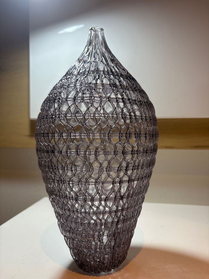 竹岡健輔作。吹きガラスの周りに編み込んだガラス。竹細工のイメージで、実際にガラスを熱で柔らかくしながら編み込んでいるという。(Art Shop月映) 撮影=田中敦子