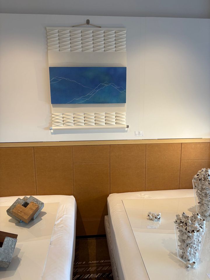 辻めぐみ作「雪嶺」 日本画、染織、そして表具を学んでいる作家。掛物を和風に仕立てず、現代的に制作している。客室の壁に掛けられることで、具体的にイメージできる。(art gallery Komori) 撮影≒田中敦子
